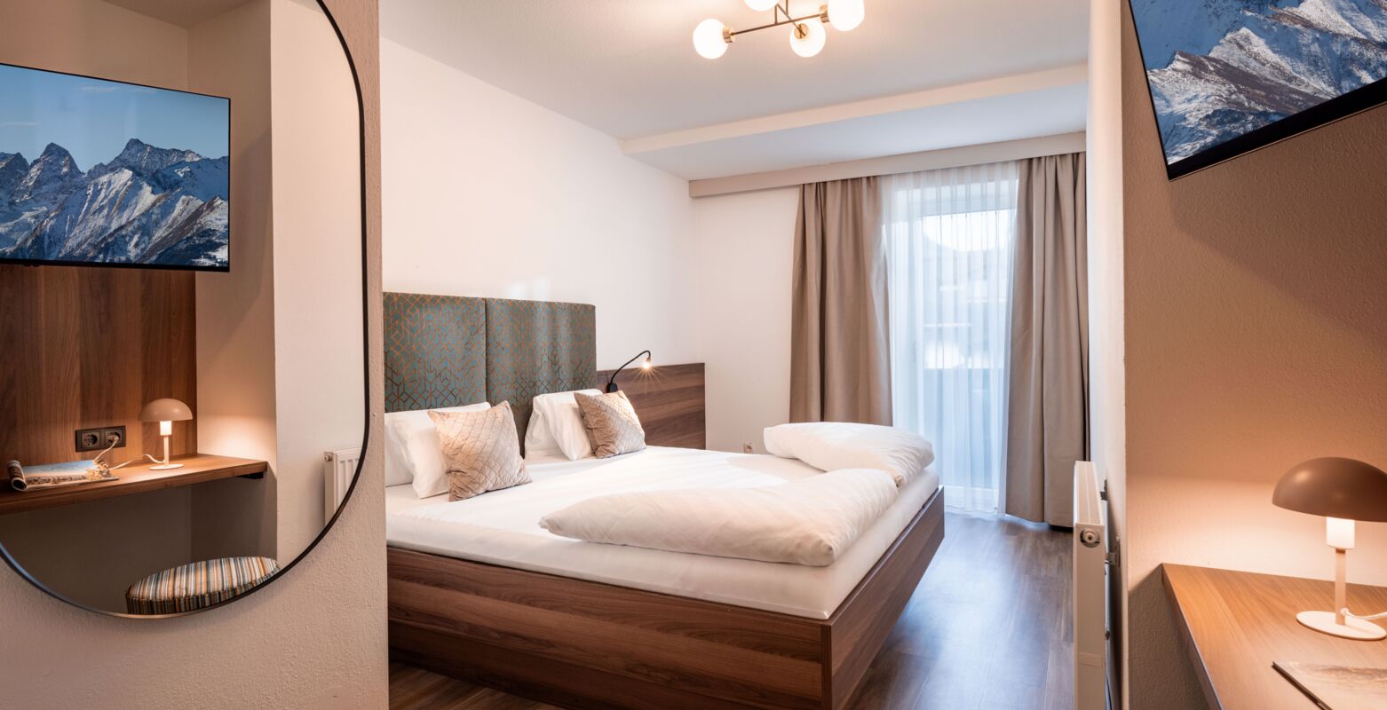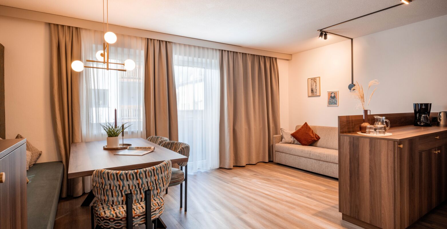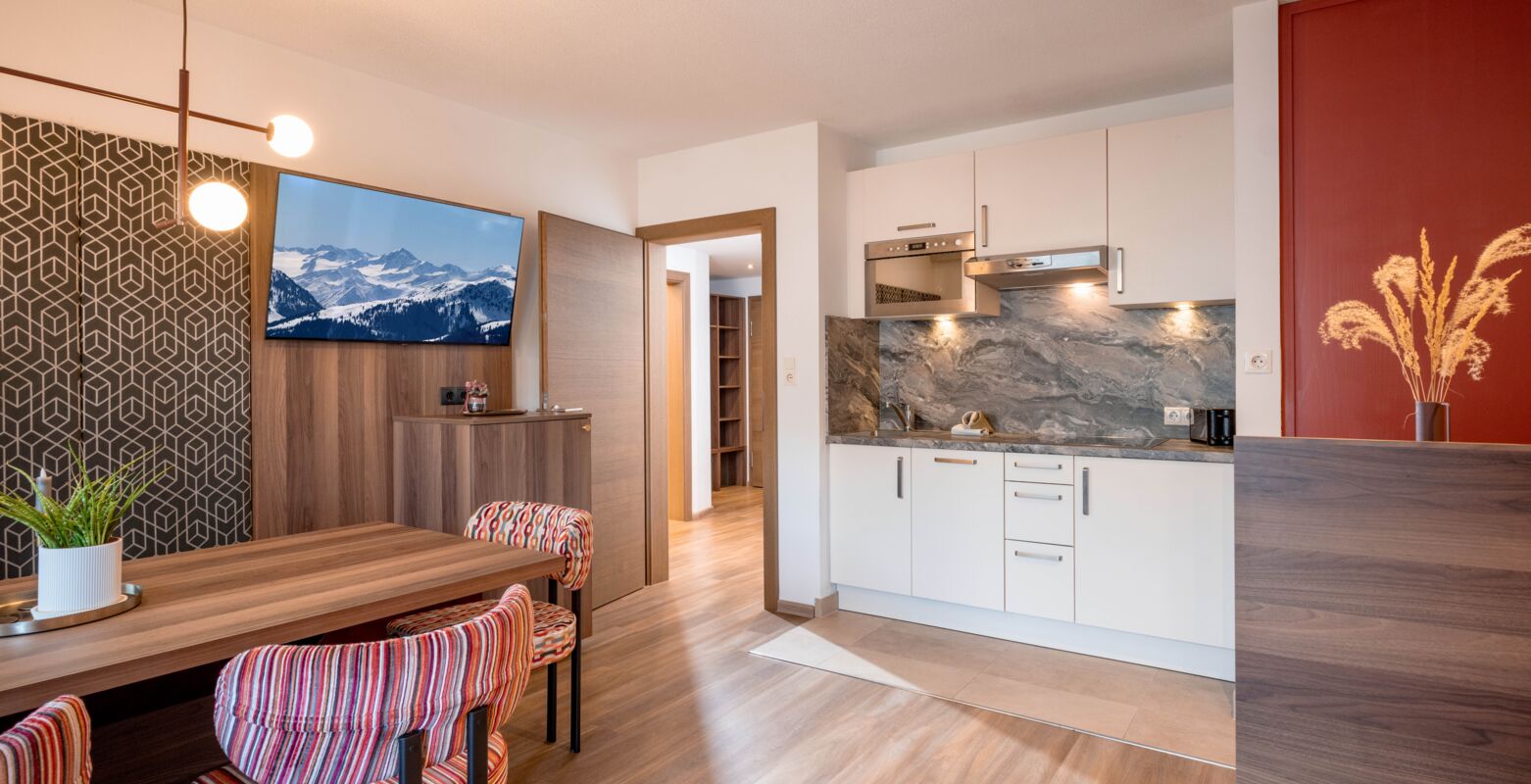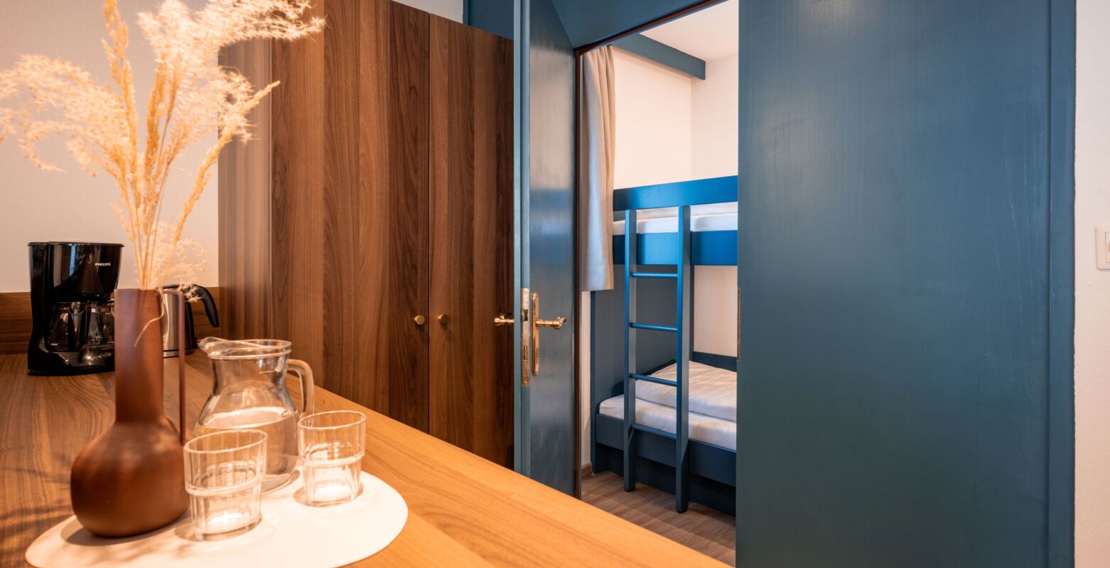 Apartment B1 zeichnet sich durch zwei Doppelzimmer sowie 1 Stockbettzimmer aus. Davon ist eins mit einem abgetrennten Badezimmer und eigenem Balkon ausgestattet. Im geräumigen Wohnbereich bietet ein Joka-Schlafsofa Platz für 2 Personen (anstelle des Stockbetts). Vom Wohnbereich aus gelangen Sie auf einen weiteren Balkon, von dem Sie die Bergwelt genießen können. Die Küche ist modernen Geräten ausgestattet: 4-Platten Induktionskochfeld, Spülmaschine, Mikrowelle, Filter-Kaffeemaschine, Wasserkocher, Toaster, geräumiger Kühlschrank von Liebherr mit Gefrierfach, sowie Koch- und Porzellangeschirr. Somit steht auch im Urlaub einer hausgemachten Mahlzeit nichts im Weg. Im Apartment befindet sich ein weiteres Bad mit Walk-in Dusche, Handtuchtrockner & Fön. Extra Komfort bietet das abgetrennte WC.