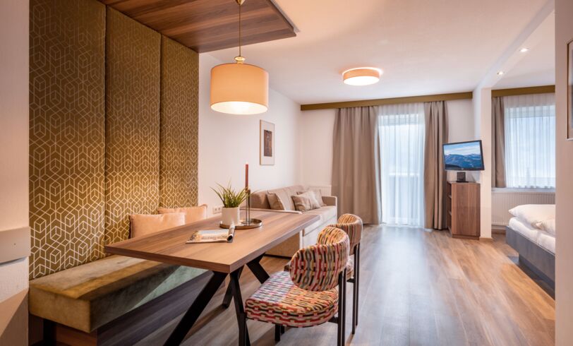 - offener Wohnbereich mit Esstisch, Sitzecke und Schlafsofa